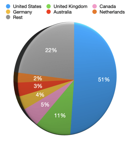 Like our writers, our audience is scattered all over the world. In total, we had views from 219 countries. The majority of them (51% of all views) are in the United States, as you can see in the chart below. This has been consistently the case; the United States is where our main audience is. The chart below lists the most important countries only.