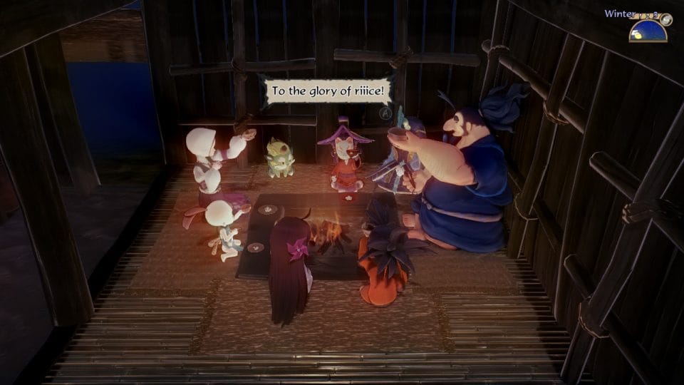 However, when you reach your new home on Hinoe, your mother’s old home, everything changes. You are now in an open area where you can freely run around. On this hill you now call home, you can build extra huts to house a forge and a loom, there’s even a coop to build for Kaimaru’s feathery friends. At the very top of the hill are two huts, one being the house for you all to stay in, the other being the storage hut for everything to do with rice.